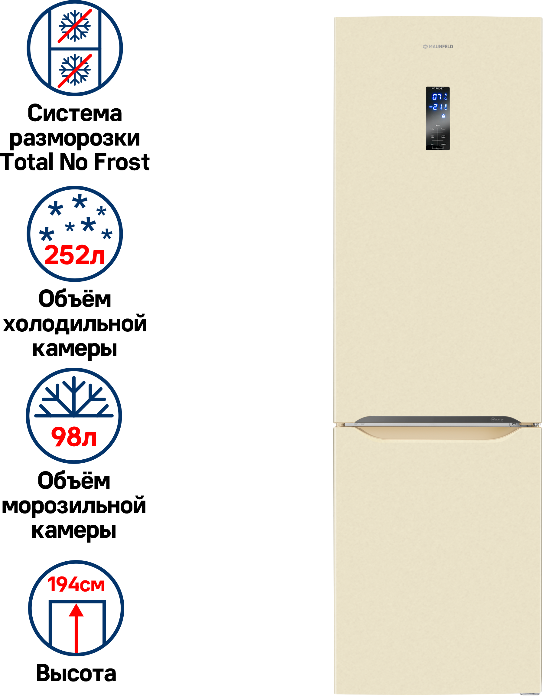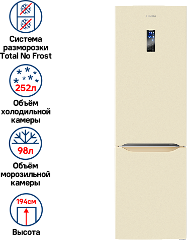 защита от детей, Full No Frost, Антибактериальное покрытие камеры, Дисплей, Светодиодная подсветка, Скрытые ручки, Суперзаморозка, Суперохлаждение
