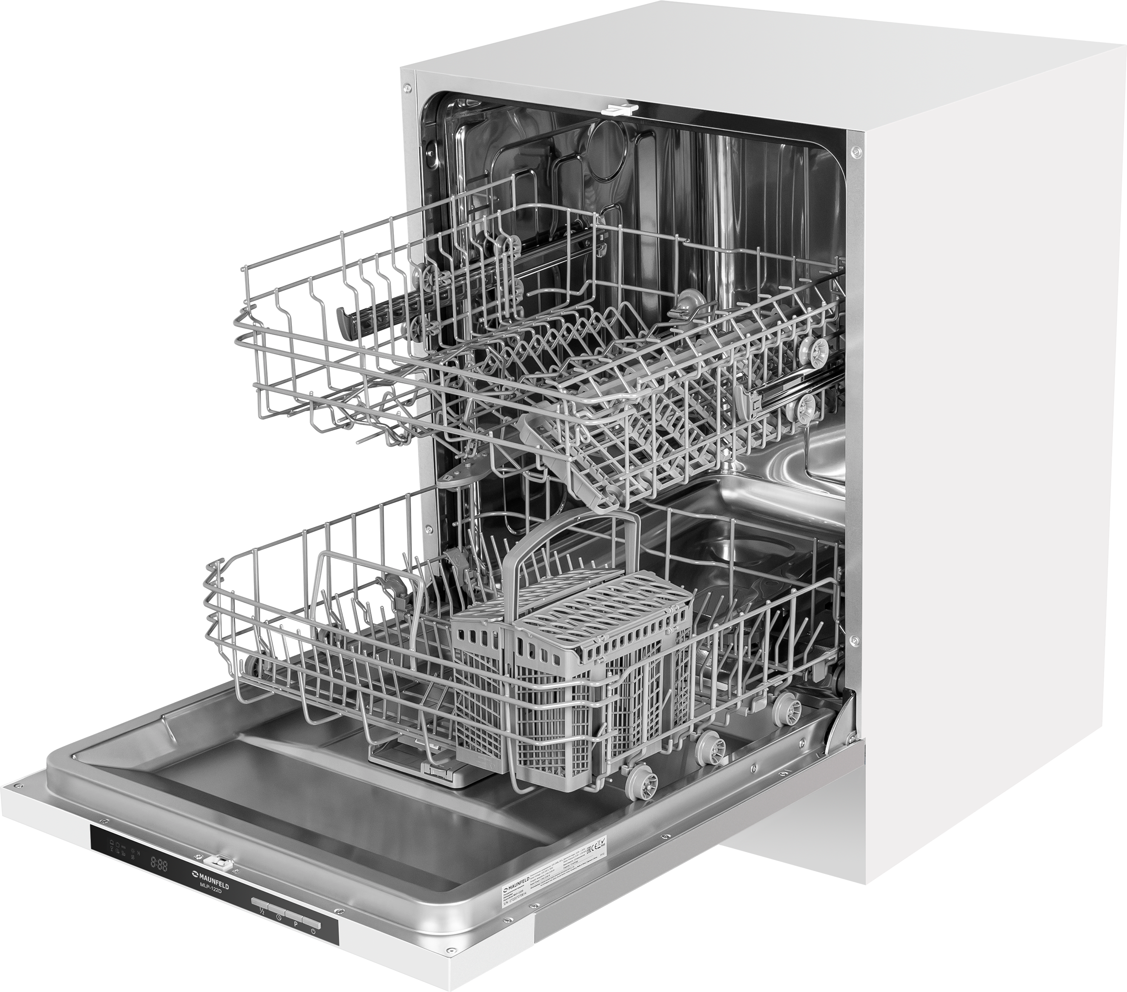 в комплекте: воронка для засыпания соли, заливной шланг, сливной шланг, нижняя корзина для посуды, верхняя корзина для посуды, корзина для столовых приборов