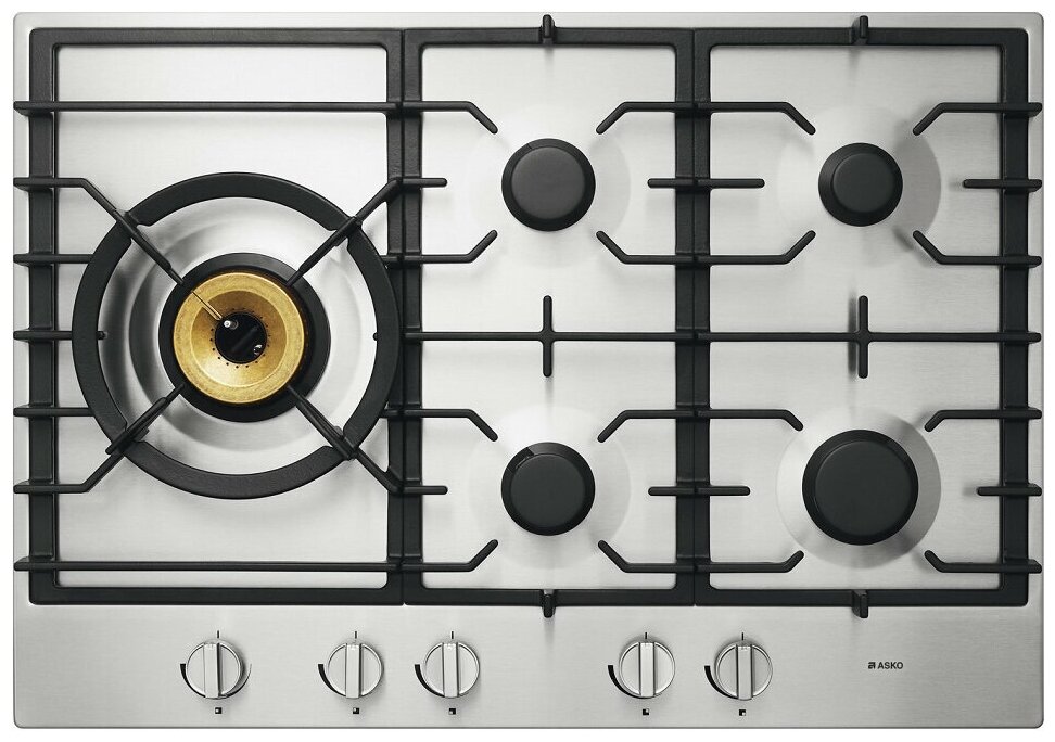 Выбор данного прибора чаще всего обусловлен тем, что в частный дом или квартиру проведен именно газ в качестве обогрева. Это оборудование абсолютно безопасно, так как оно обладает тщательно продуманной системой защиты. Благодаря специальным датчику и клапану при случайном угасании огня газ мгновенно блокируется и перестает поступать — утечка предотвращена. На поверхности расположено пять конфорок — одна мощностью 1 кВт, две — по 2 кВт, четвертая имеет мощность 3 кВт, и последняя — 4,6 кВт. Особенность, на которую стоит обратить внимание — конфорка WOK. Она имеет три ряда пламени и обеспечивает быстрый нагрев, а благодаря специальной насадке на неё можно ставить и вок-посуду.